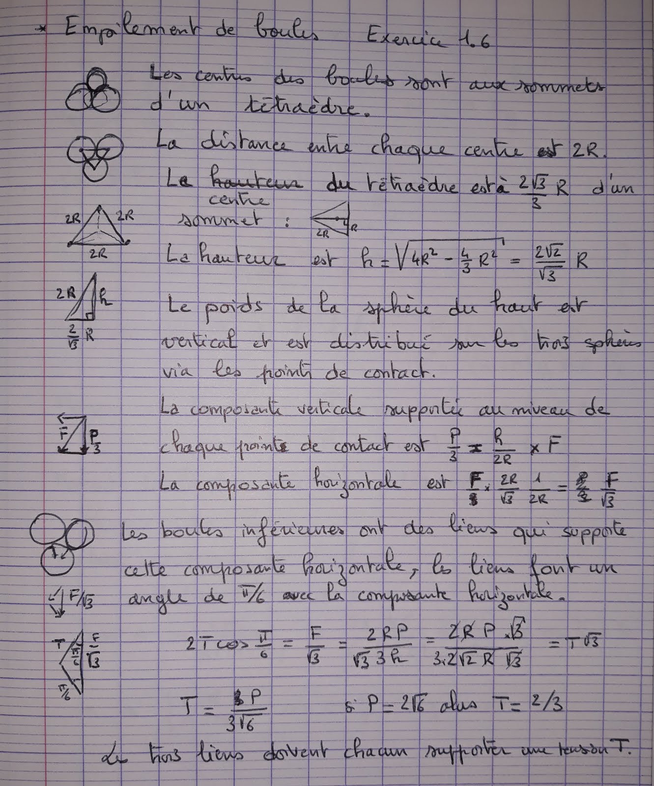 On peut calculer la hauteur du centre de la sphère du haut, le poids (vertical) de cette sphère est réparti sur les trois autres au niveau des points de contact.